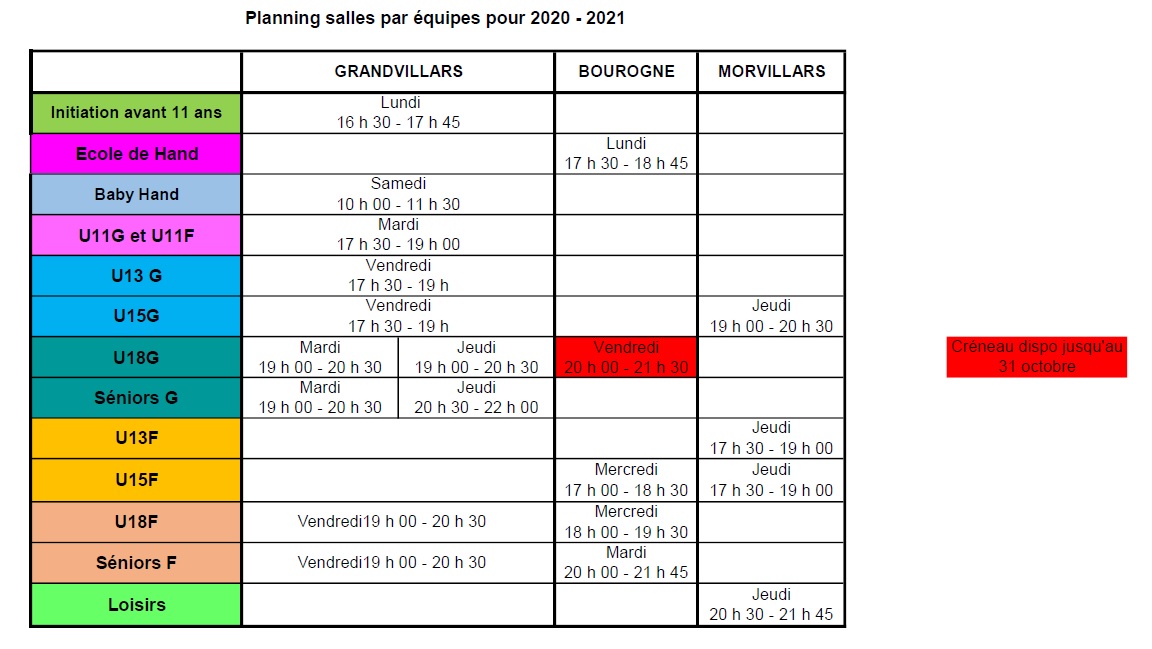 Vous trouverez dans l'image suivante le planning des équipes pour la saison 2020-2021.