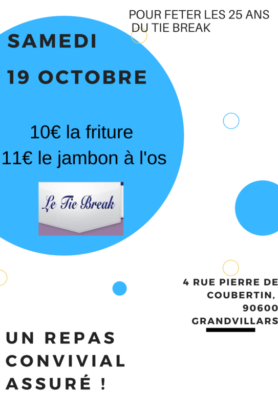 A l'occasion des 25 ans du restaurant le TIE BREAK, il serait sympa de se retrouver autour d'un repas convivial pour fêter dignement cet anniversaire !